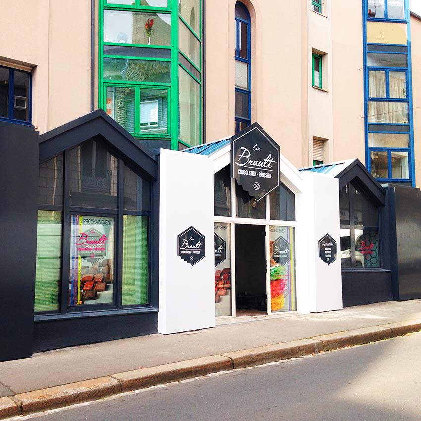 Brault est une chocolaterie dans la région de Rennes. Pour ce projet là, nous devions habiller toute la façade avec du Dibond 3 mm rainé, plié pour obtenir un design totalement différent du bâtiment d’origine. Ce chantier a demandé beaucoup de précision pour avoir les dimensions exactes de la façade. Puis nous sommes venus poser un adhésif plein avec les éléments décoratifs du client.