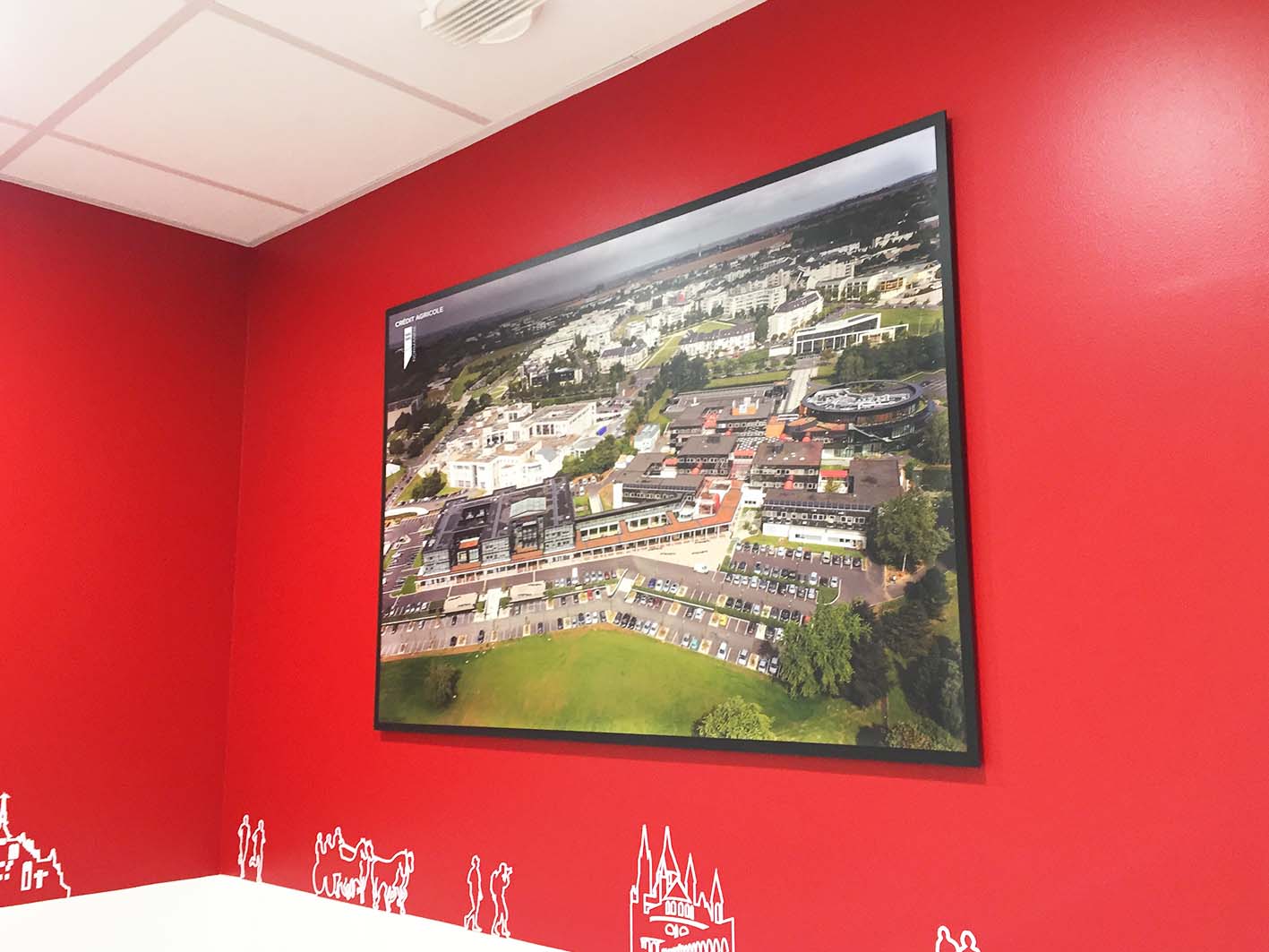 Plusieurs cadres ont été réalisés pour une décoration intérieure d’Empreinte Locale au Crédit Agricole. Pour ce projet, nous avons utilisé des plaques de PVC 5mm noir que nous sommes venus recouvrir d’un adhésif imprimé avec différentes photos représentant la région. Ces photos sont disposées de manière à laisser apparaître le PVC noir et créer, ainsi un encadré pour les habiller.